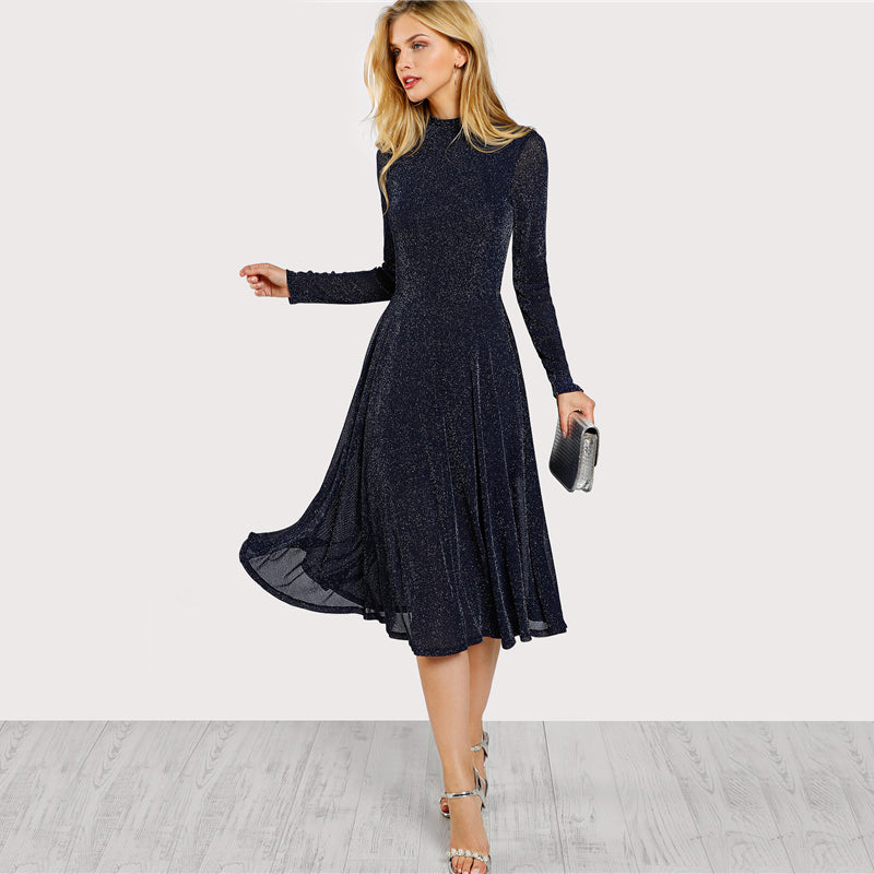 Robe slim mi longue satinée bleu marine Manches longues