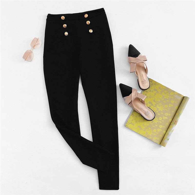 Pantalon noir taille mi haute détails boutons style:  crayon Composition : Polyester, élasthane